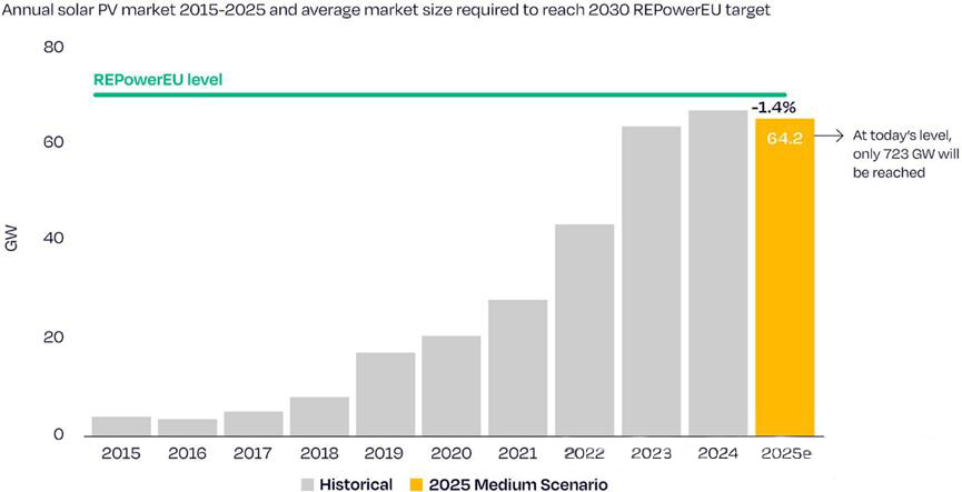 В доклада се твърди, че рекордните годишни нови фотоволтаични (PV) инсталации през последните няколко години са позволили на ЕС да постигне преди това на пръв поглед невъзможната си цел за фотоволтаични инсталации от 320 GW променлив ток (400 GW постоянен ток) до края на 2025 г. По-специално, конфликтът между Русия и Украйна през 2022 г. предизвика рязко покачване на цените на енергията в Европа, генерирайки значително търсене на жилищни фотоволтаични системи. Това доведе до експлозивен растеж на фотоволтаичните инсталации в ЕС през 2022 г. и 2023 г., с темпове на растеж съответно от 47% и 51%, преди да паднат до едноцифрени числа (3,3%) през 2024 г. Според неутрална прогноза, новите инсталации през 2025 г. се очаква да намалеят с 1,4% на годишна база, което ще отбележи първия отрицателен годишен темп на растеж от 2015 г. До края на 2025 г. кумулативните фотоволтаични инсталации в ЕС ще достигнат 402 GW (постоянен ток).