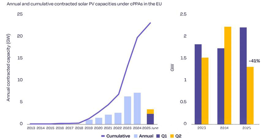 През първото тримесечие на 2025 г. подписаните договори по PPA (Споразумения за покупка на електроенергия) достигнаха 2,2 GW, поддържайки тенденция на растеж. Пазарът обаче показа ясни признаци на забавяне през второто тримесечие, като подписаните договори спаднаха с 41% до 1,3 GW, най-ниското ниво от близо три години. Докладът смята, че постоянно ниските, дори намаляващи, цени на едро на електроенергията са отслабили ентусиазма на потребителите на електроенергия да подписват дългосрочни споразумения, докато предприемачите, ограничени от фиксираните инвестиционни разходи, не желаят да подписват договори на ниски цени. Очаква се ценовата конкуренция да продължи да влияе върху мащаба на новите договори, докато не се постигне ново равновесие.