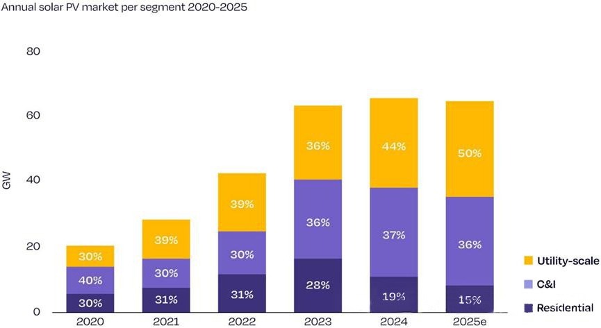 Постепенното премахване на субсидиите за проекти за жилищна електроенергия в много страни доведе до забавяне на растежа, превръщайки наземните електроцентрали в основен вариант.